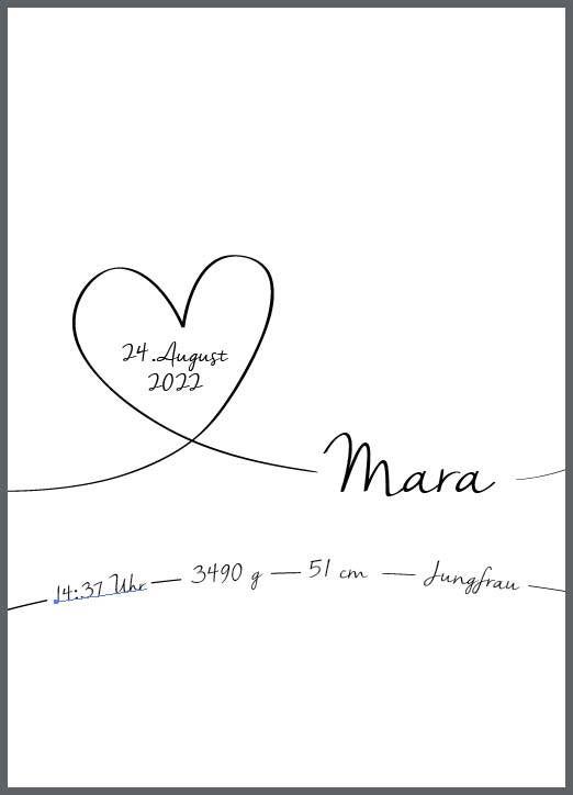 Mit einem optionalen Druck auf verschieden farbige Untergründe können Sie die Daten der Geburt des Kindes festhalten. Dabei gibt es verschiedenste Möglichkeiten: